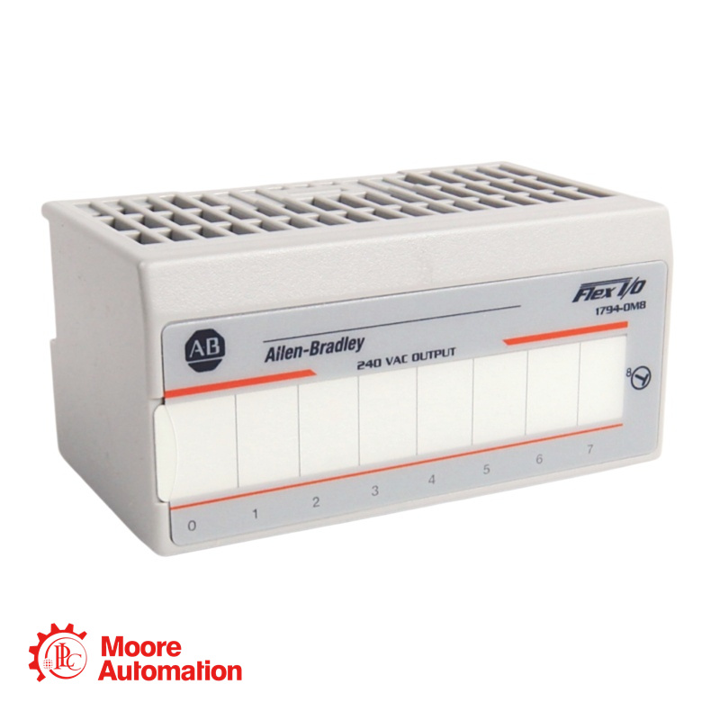 The 1794-OM8 Flex I/O Digital Output Module has 8 Nonisolated Outputs, a 240V AC Output Voltage nom., and a 4.0A Output Current Rating. It also operates with a 1.5V AC @ 0.5A On-state Voltage Drop max. and a 2.5mA Off-state Leakage max.