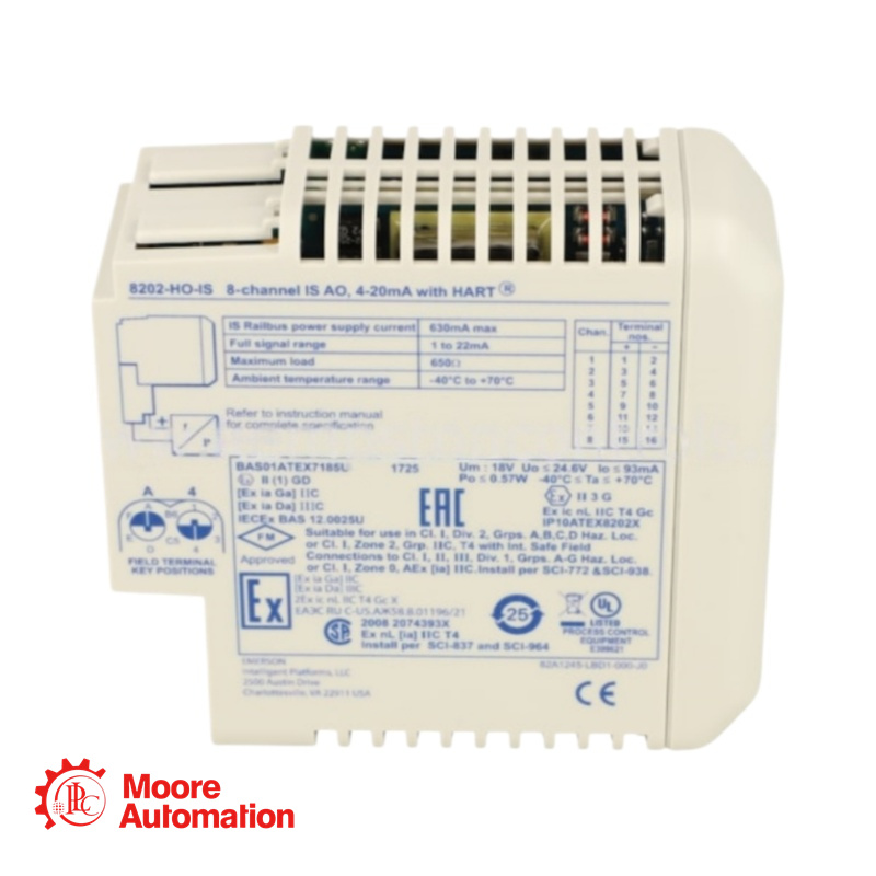 The 8202-HO-IS is an 8-channel analog output module designed for industrial process control and safety systems. It provides 4-20 mA current outputs specifically intended to drive I/P (Current-to-Pressure) converters and actuators. The module features Intrinsically Safe (IS) field circuits, allowing direct connection to devices located in hazardous areas without the need for external isolators or zener barriers. It supports HART pass-through communication, enabling digital configuration and diagnostics of smart field devices connected to the output loop.